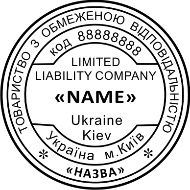 Печать ООО на английском языке, которую Вы просматриваете сейчас, мы рекомендуем заказывать синего цвета. В случае если у Вас есть фирменный стиль компании, можете попробывать подобрать под него цвет оттиска. Синий цвет используется приблизительно в 95% оттисках печати ООО. При необходимости можно будет потом поменять цвет, заменив чернильную подушку в оснастке.