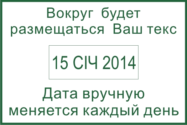 На этой странице у Вас есть возможность заказать Штамп датер. Для того, что бы это сделать, нажмите кнопку «купить», а затем «оформить заказ». Далее заполните поля оформления заказа, а в поле "комментарий к заказу" напишите текст, который нужно разместить внутри штампа.